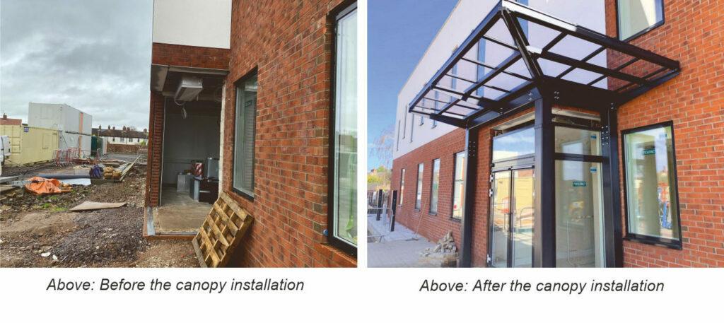 The order was placed in February 2023 for a 3 1 metre x 1 5 metre canopy with a hip, enabling it to follow the external corner of the entrance, into a 1 41 metre x 1 5 metre canopy