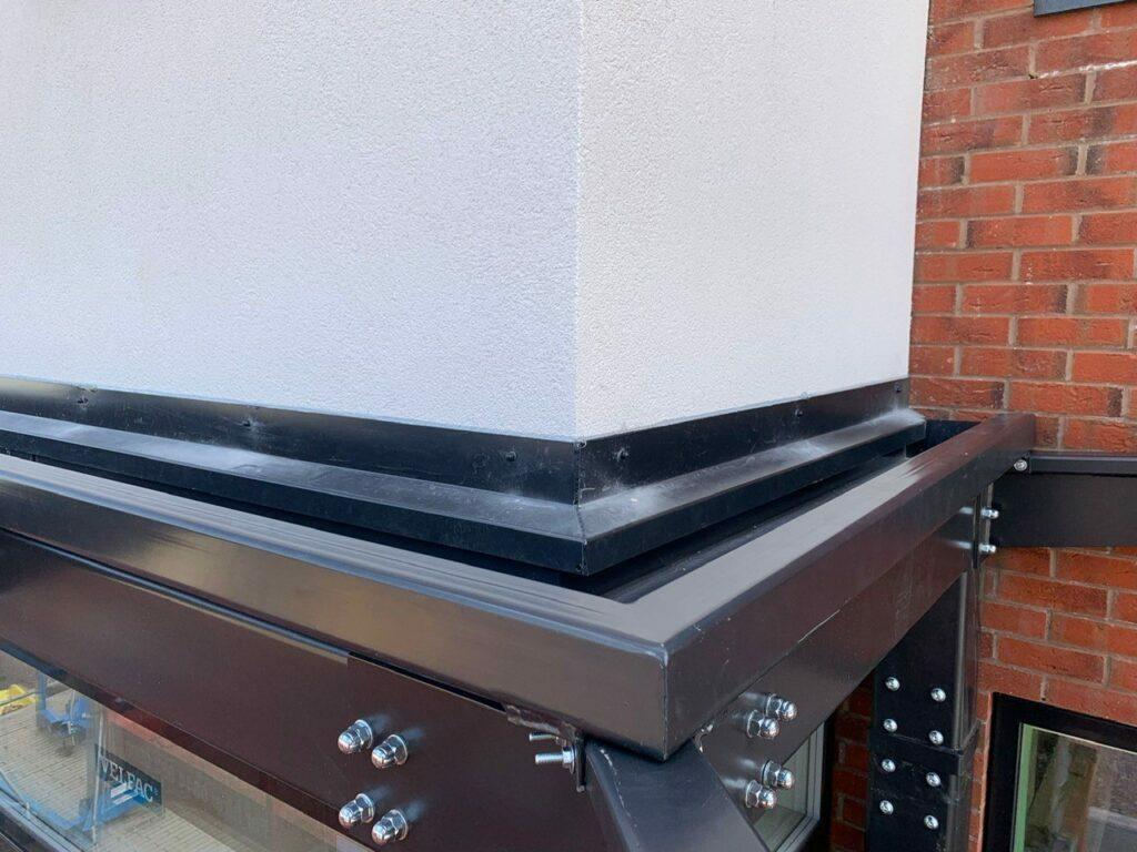 The existing concrete wall that we planned to install the canopy against was only 2.7m high which would leave a 400mm gap between the height of the canopy and the top of the wall, we therefore used a PVC flat board to bridge the gap Whilst this could not guarantee a watertight seal, it would dramatically reduce driving rain coming in from the back of the canopy