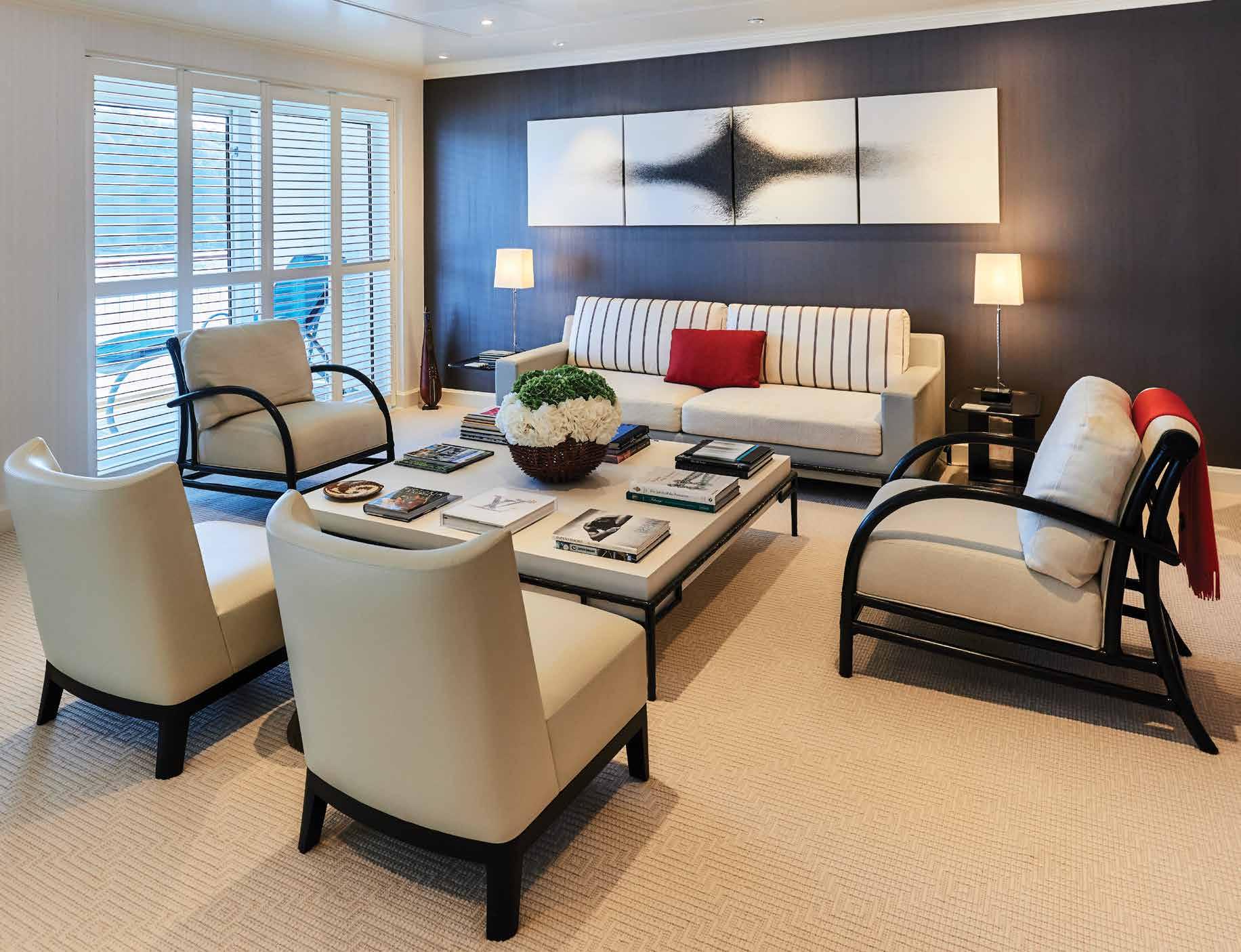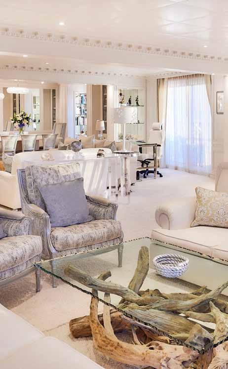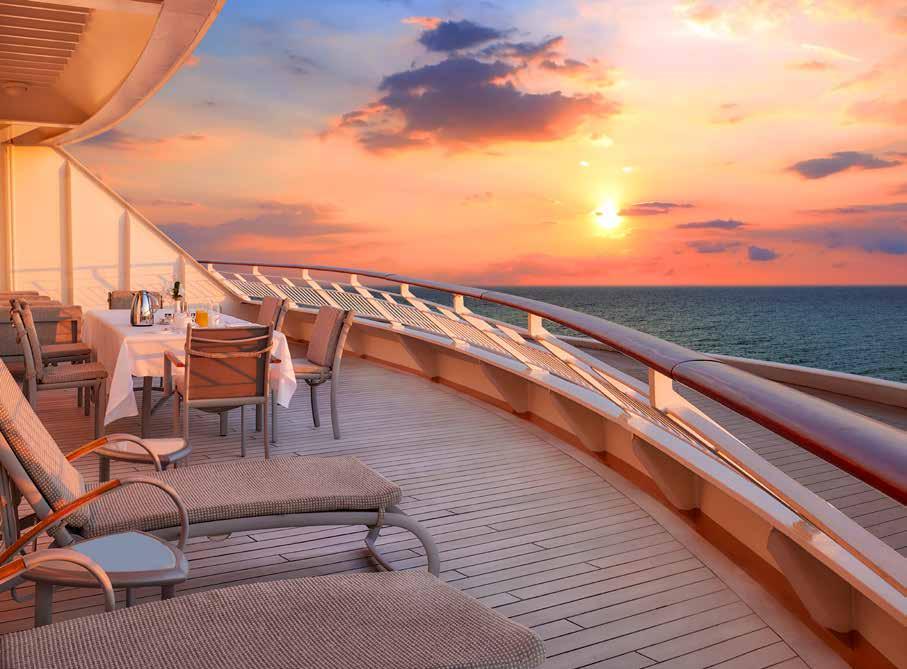 Ocean Studios aboard The World are designed with soothing neutral tones and classic contemporary décor to make anyone feel a sense of comfort and tranquility. All Ocean Studios feature a marble bathroom with a separate tub and shower, as well as the convenience of a mini-refrigerator, writing desk, and entertainment center. Many studios feature flat-screen TVs and walkin wardrobes. A private veranda completes the picture, offering awe-inspiring views of the sea and the many destinations along The World’s infinite course.