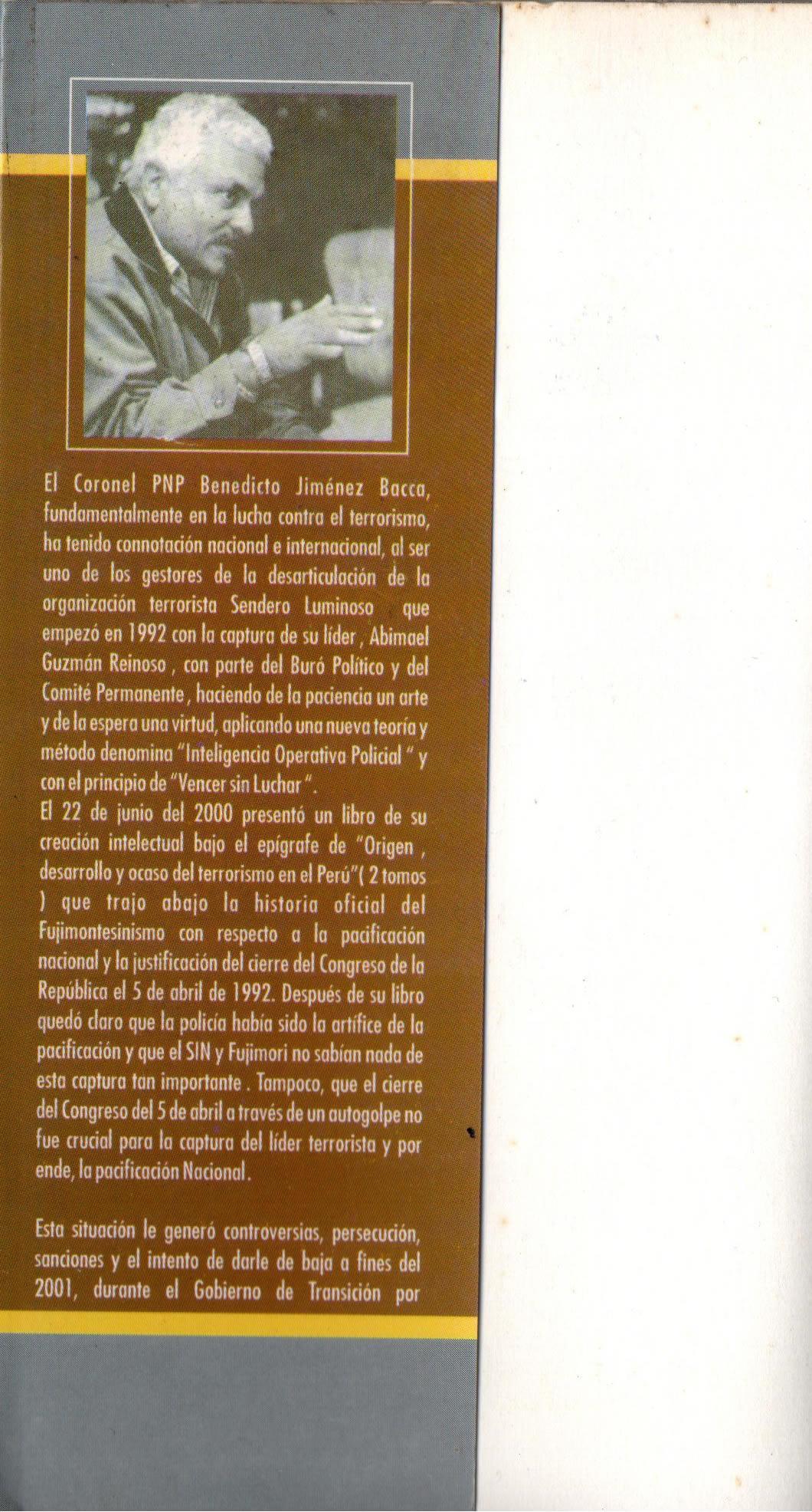El libro "El precio de la libertad" narra la experiencia del coronel PNP Benedicto Jimenez Bacca cuando se atrevió a publicar en el 2000, en pleno auge del Fujimontesinismo, la obra " La Captura del Presidente Gonzalo" y "El ABC de Sendero Luminoso". Esta publicación, las entrevistas que dio a la prensa, le ocasionó un procedimiento administrativo, sanción de ocho horas de rigor y tres denuncias ante el fuero privativo por desobediencia, insulto al superior e infidencia que lo condujo a pedir su retiro a fines del 2003 porque cada vez que se presentaba a General, una "mano siniestra" hacía conocer al ministro del Interior sobre estas tres denuncias que saldrían a conocimiento público si ascendía .