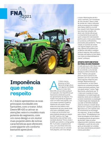 Imponência que mete respeito A J. Inácio apresentou as suas principais novidades em Santarém, com o trator John Deere 8R 410 a cativar as atenções: este é o modelo mais potente do segmento, com um novo design e um motor mais pujante além de outras características que oferecem a este gigante um conforto bastante apreciável. 72