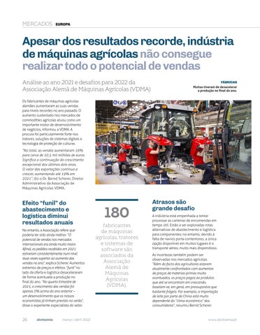 Atrasos são grande desafio A indústria está empenhada a tentar processar as carteiras de encomendas em tempo útil. Estão a ser exploradas rotas alternativas de abastecimento e logística para componentes; no entanto, devido à falta de navios porta-contentores, a única opção disponível em muitos lugares é o transporte aéreo, muito mais dispendioso. As incertezas também podem ser observadas nos mercados agrícolas. “Além do facto dos agricultores estarem atualmente confrontados com aumentos de preços de matérias-primas muito acentuados, os preços pagos ao produtor, que até se encontram em crescendo, baseiam-se, em geral, em pressupostos que bastante frágeis. Por exemplo, a importação de leite por parte da China está muito dependente do “clima económico” dos consumidores”, resumiu Bernd Scherer.
