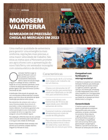 MONOSEM VALOTERRA SEMEADOR DE PRECISÃO CHEGA AO MERCADO EM 2023 Uma melhor qualidade de sementeira para garantir uma emergência mais uniforme, regulações mais precisas, e uma maior velocidade de trabalho. São estas as metas que a Monosem promete aos agricultores com a apresentação do novo ValoTerra, um semeador monogrão com sistema elétrico de distribuição.