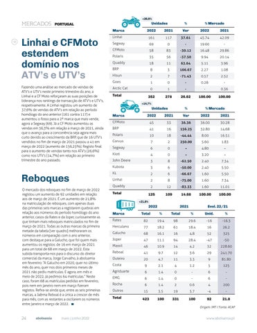 Reboques O mercado dos reboques no fim de março de 2022 registou um aumento de 92 unidades em relação aos de março de 2021. É um aumento de 21,8% na matriculação de reboques, com apenas duas das primeiras seis marcas a registarem quebras em relação aos números do período homólogo do ano anterior, casos da Rates e da Joper, curiosamente as que tinham mais reboques matriculados no fim de março de 2021. Todas as outras marcas da primeira metade da tabela [ver quadro] melhoraram os números em comparação com o ano anterior, com destaque para a Galucho, que foi quem mais aumentou os registos: de 16 em março de 2021 para um total de 68 em março de 2022. Esta subida transporta-nos para o discurso do diretor comercial da marca, Jorge Carvalho, à abolsamia em fevereiro: “A Galucho em 2020, quer no último mês do ano, quer nos dois primeiros meses de 2021 não pediu matrículas. E agora, em mês e meio de 2022, já pedimos 64 matrículas.” Neste caso, foram 68 as matrículas pedidas em fevereiro, pois nem em janeiro nem em março fizeram registos. Refira-se ainda que, entre as seis primeiras marcas, a Ja&ma Reboal é a única a crescer de mês para mês, com as restantes a oscilarem os números entre janeiro e março de 2022.