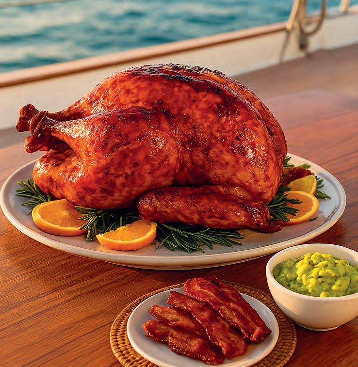 Some celebrations smell like home; others taste like a voyage. Thanksgiving in the heart of the Caribbean blends both: the warmth of family and the calm of the sea. On deck, as the sun sinks over the harbor, the aroma of butter, cane syrup, and rum mingles with the salty breeze. The turkey steals the scene—golden as a sunset, glazed with the easy rhythm of the islands.