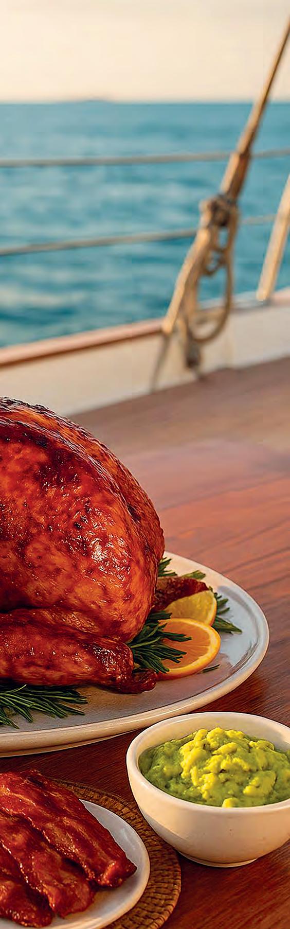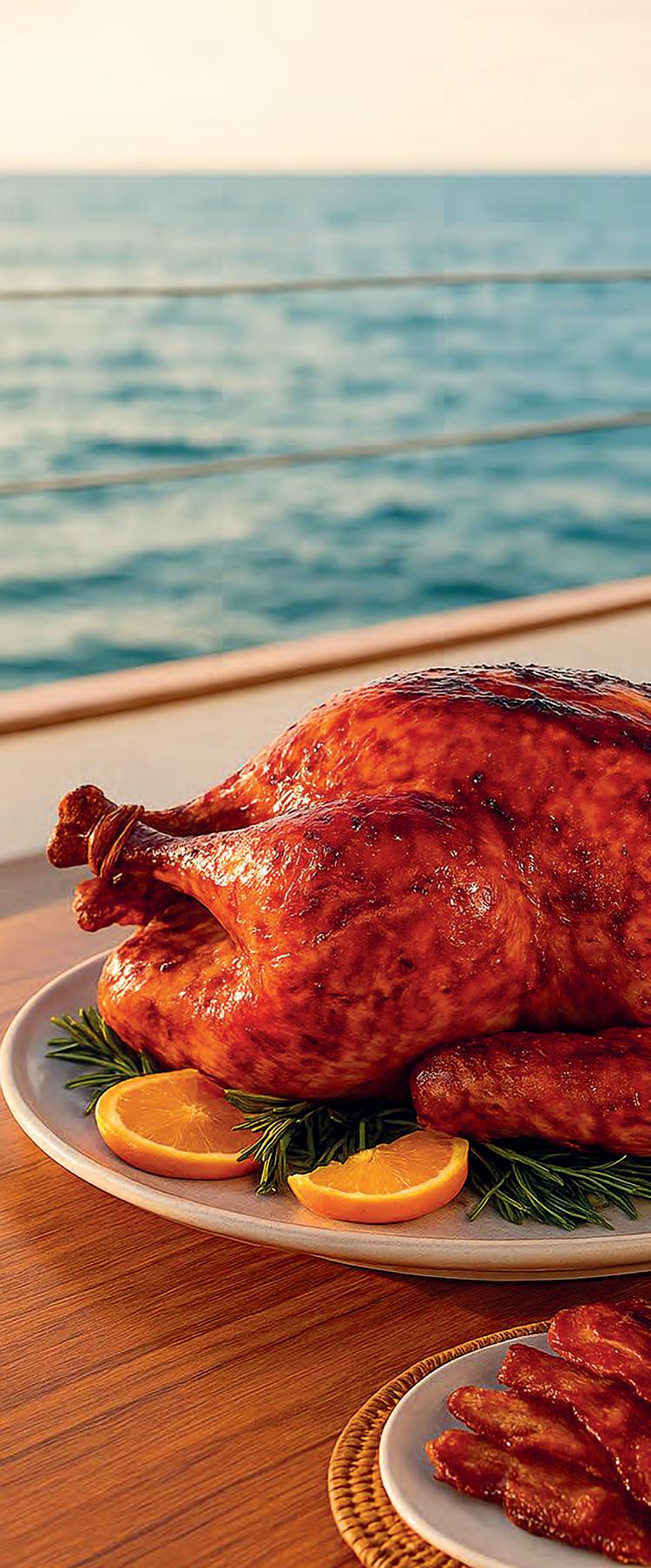 Aboard, the toast is made facing the horizon. Because in the Caribbean, even turkey tastes like a journey—like gratitude and a free wind.