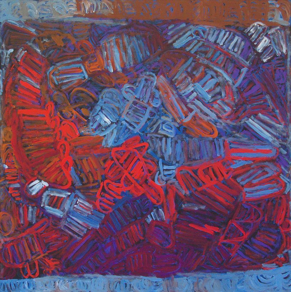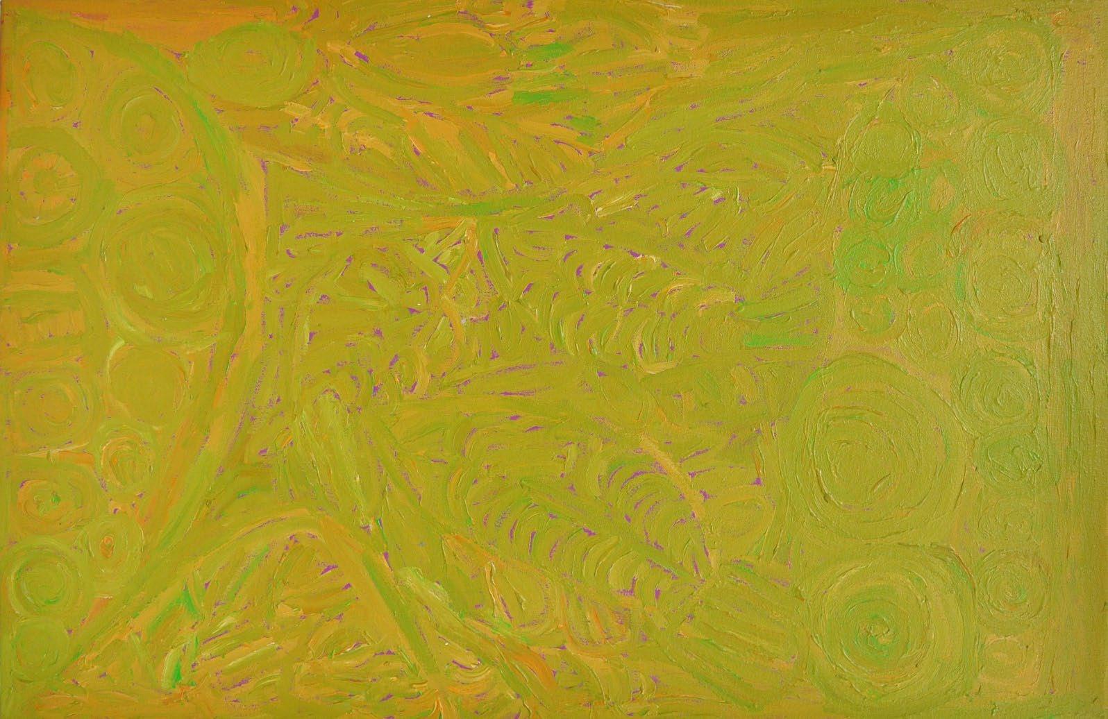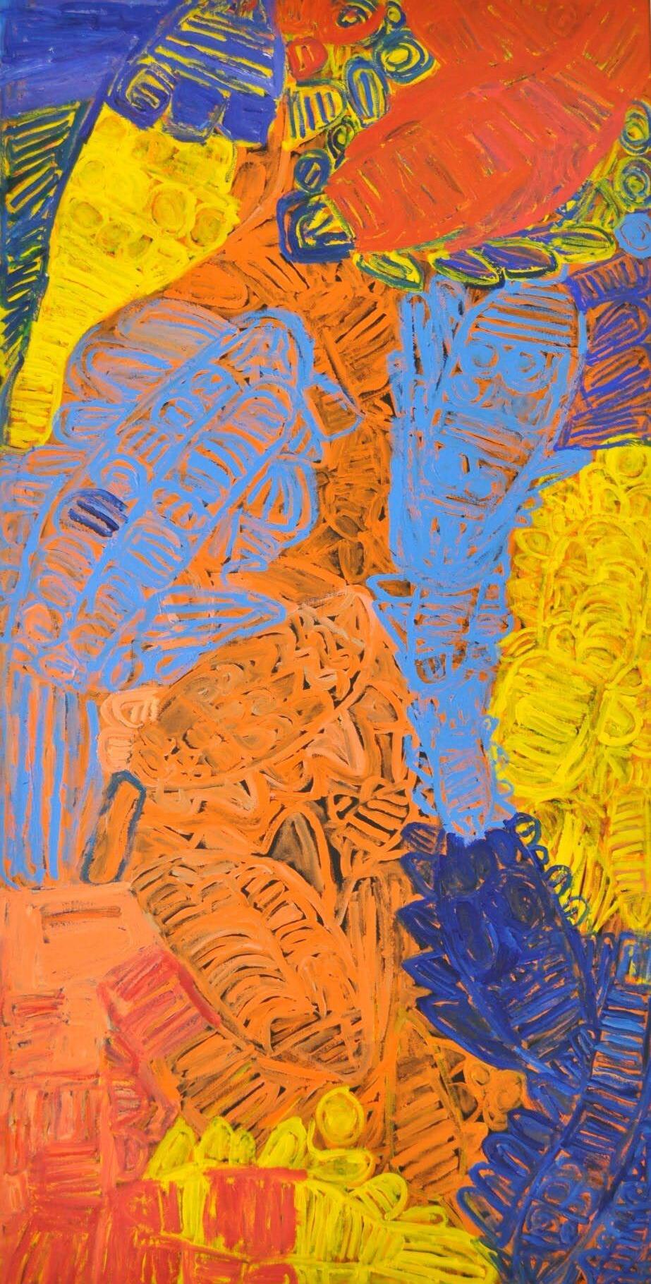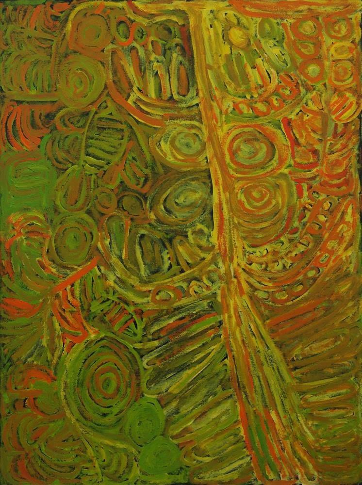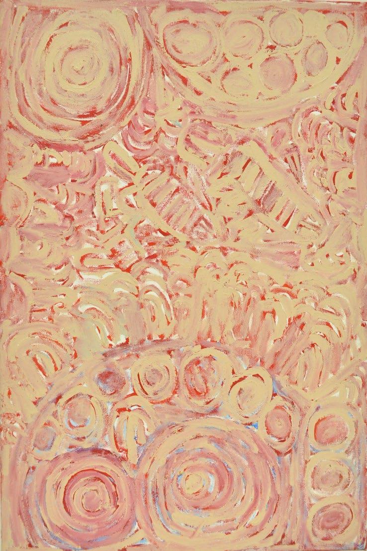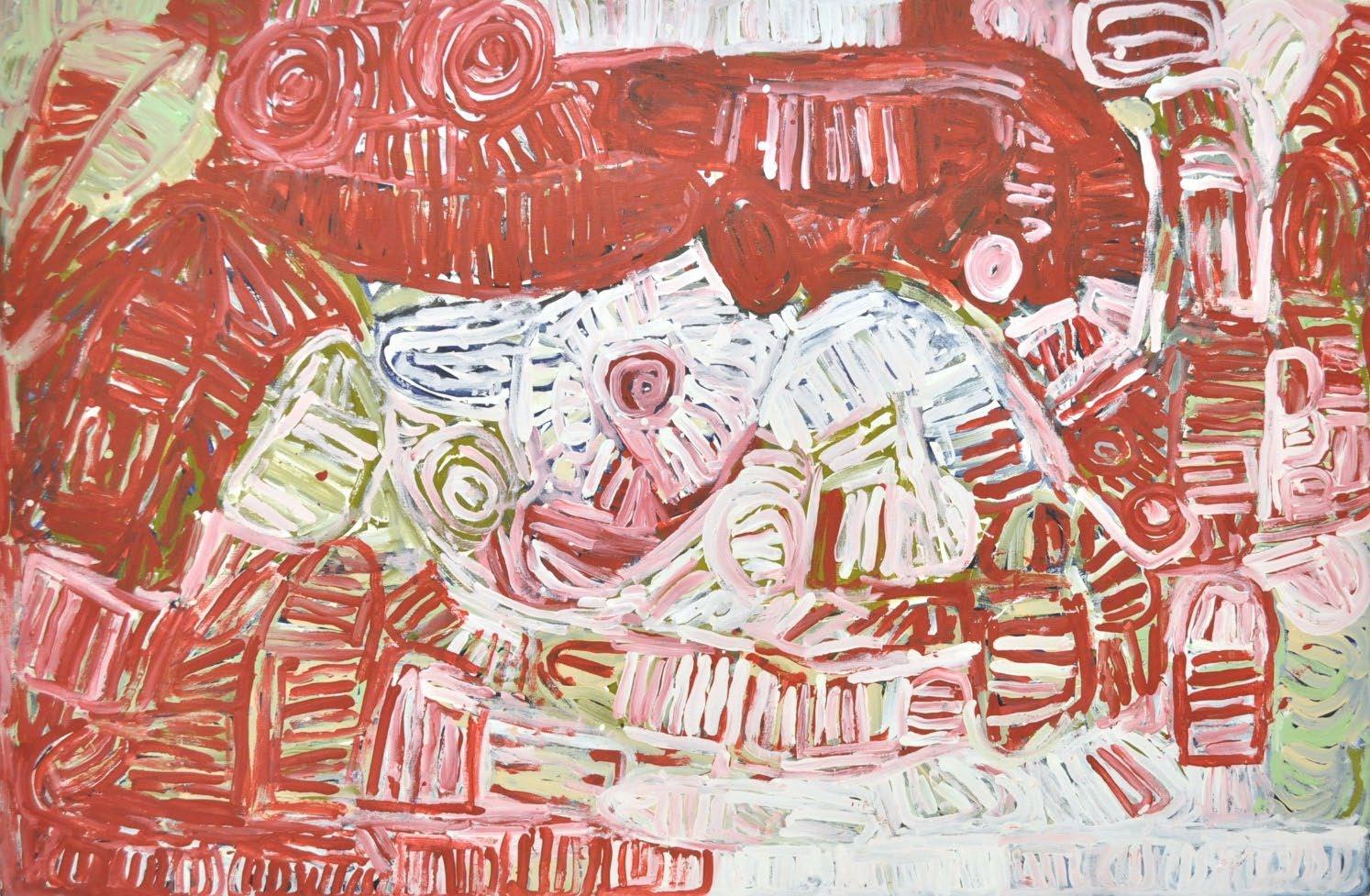 Ms Kurarra painted these images repeatedly, as though they were etched into her psyche. Some works are linear representations in monotones; others are layered compositions, lathered on with wild, confident brushstrokes and expressive mark-making. These contemporary compositions display an outstanding understanding of colour and form. Ms Kurarra is one of the cornerstones of Mangkaja Arts and is considered a significant contributor to contemporary artmaking in the Fitzroy Valley region.