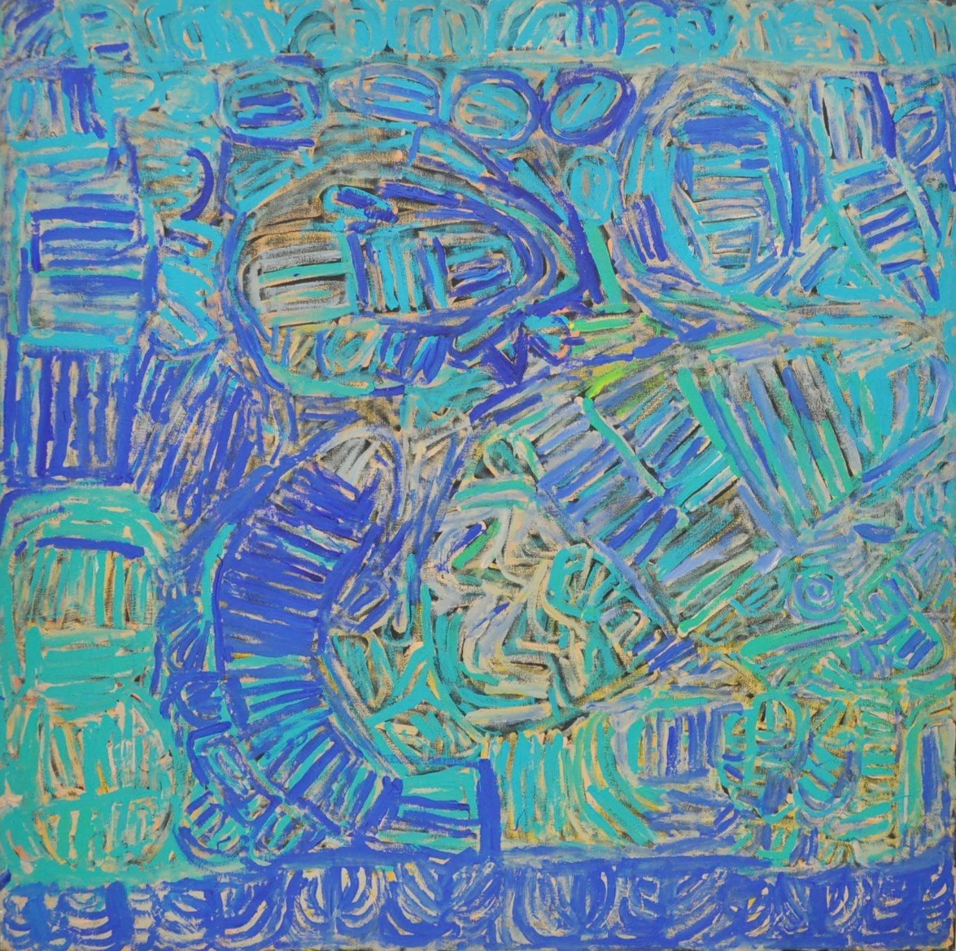 Ms Kurarra was born by a billabong at Noonkanbah Community. Her parents were Walmajarri whose movements led them to live along the Fitzroy River. Ms Kurarra lived most of her life at Noonkanbah. A compulsive artist, she was a teacher’s aide at the local school for many years, where she facilitated artmaking with the children. Illustrative of her attachment to the Country where she grew up and her intimate life with the river, Ms Kurarra’s art is saturated with river-country motifs, including parlka (barramundi), bream, tortoise, stingray, pandanus trees, and the water itself.