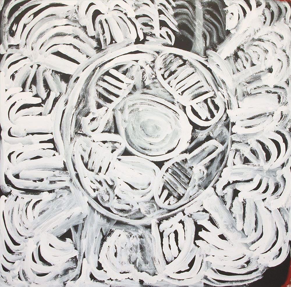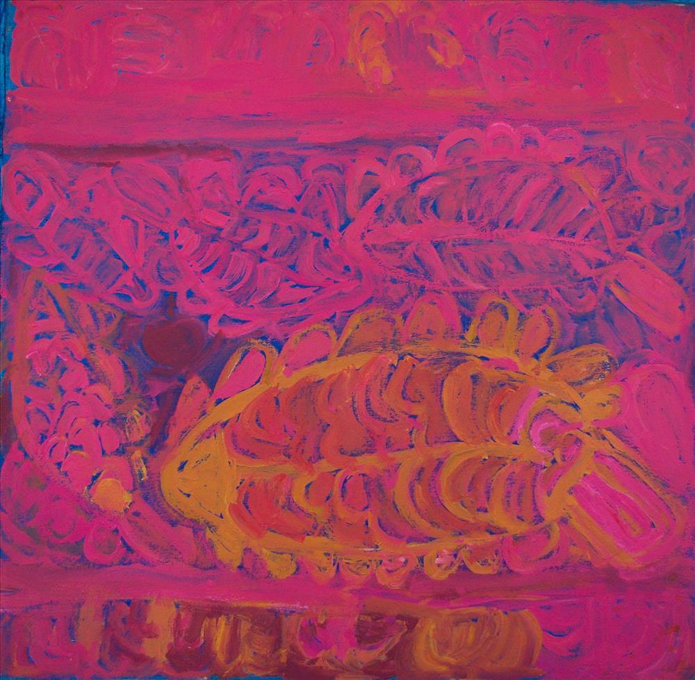 Martuwarra “Martuwarra is my river country; this painting is all about the Fitzroy River which flows down through Noonkanbah where I live. All kinds of fish live in the water; we catch big mob of fish here. I like Parlka(barramundi). We catch catfish and brim here too. Nganku (shark), Wirritunany (swordfish) and stingray also live here. These fish livein these waters long after the flood has gone. Also, this painting is about barramundi swimming on the surface of the water, you can see the Wakiri (Pandanus tree) and rocks all around. When the barramundi gets tired, they go back into the rock holes. These rock holes hold all the Parlka (barramundi) that live in the river. Kalpurtu (creator serpent-type being) also live in these rock holes and swim all around the Palma (creeks) and all around the Wakiri that grows in the river.”