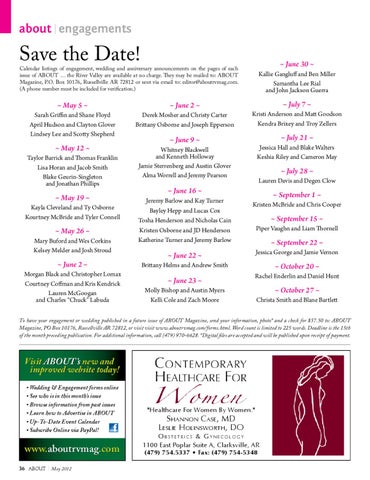 Calendar listings of engagement, wedding and anniversary announcements on the pages of each issue of ABOUT … the River Valley are available at no charge. They may be mailed to: ABOUT Magazine, P.O. Box 10176, Russellville AR 72812 or sent via email to: editor@aboutrvmag.com. (A phone number must be included for verification.)