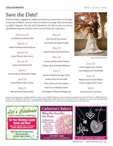 Calendar listings of engagement, wedding and anniversary announcements on the pages of each issue of ABOUT…the River Valley are available at no charge. They may be mailed to: ABOUT Magazine, P.O. Box 10176, Russellville AR 72812 or sent via email to: editor@aboutrvmag.com. (A phone number must be included for verification.)