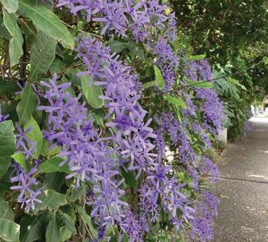 In climates too warm to grow wisteria, grow purple wreath (Petrea volubilis ) instead. This woody, evergreen climber is a tropical to subtropical climber bearing long-lasting, wisteria-like flowers from late winter to late summer. Best grown over a pergola, fence or trellis, it prefers full sun or part shade and a rich, well-drained soil. Prune hard after flowering.