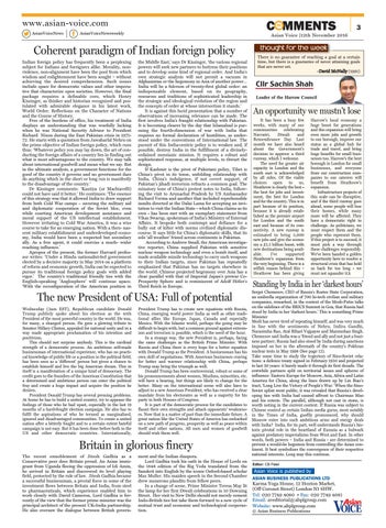 Standing by India in her ‘darkest hours’ Sergei Chemezov, CEO of Russia’s Rostec State Corporation, an umbrella organization of 700 hi-tech civilian and military companies, remarked, in the context of the Modi-Putin talks on the sidelines of the BRICS Summit in Goa, that Russia had stood by India in her ‘darkest hours.’ This is something Prime Minister Modi has never tired of repeating himself, and was very much in line with the sentiments of Nehru, Indira Gandhi, Narasimha Rao, Atal Bihari Vajpayee and Manmohan Singh. Chemezov said India was a ‘friend and ally and not just a business partner; Russia had also stood by India during sanctions imposed on her in the aftermath of the country’s Pokhran nuclear tests in May 1998 (See page 12). Take some time to study the trajectory of Sino-Soviet relations: a defence treaty signed in February 1950 and projected to last 30 years: it barely made it through its first decade. The erstwhile partners split on territorial issues and spheres of influence: Eastern Europe for Moscow, Asia, Africa and Latin America for China, along the lines drawn up by Lin Biao’s tract, ‘Long Live the Victory of People’s War.’ When the SinoSoviet splint went public, it was revealed that Russia’s developing ties with India had caused affront to Chairman Mao and his coterie. The parallel, although not cast in stone, is worth noting in the current context. If Russia was subject to Chinese control as certain Indian media gurus, most notably in the Times of India, goofily pronounced, why should Moscow enter into such ambitious arms and energy deals with India? India, for its part, well understands Russia’s historic pivotal role in the heartland of Eurasia as a bulwark against predatory imperialisms from West and East. In other words, both powers – India and Russia - are determined to prevent a would-be hegemon from controlling the Asian continent. It best symbolizes the convergence of their respective national interests. Long may this continue. Editor: CB Patel