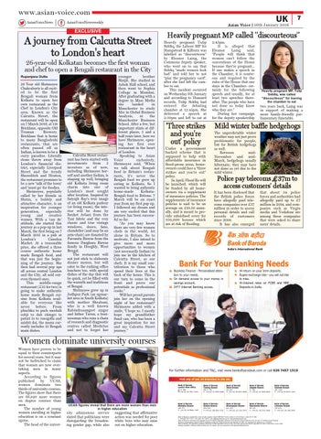 younger brother Shrijit. She studied in Ashok Hall school, and then went to Sophia College in Mumbai. After graduating with a degree in Mass Media she landed in Manchester to study Msc in Global Business Analysis, at the Manchester Business School. After a few, but important stints at different places, 5 and a half years later, here we have Shrimoyee, opening her first ever restaurant in the heart of London. Speaking to Asian Voice exclusively, Shrimoyee said, “When we talk about Bengali food in Britain's restaurants, it's never the Bengali food we grew up eating in Kolkata. So I wanted to bring authentic home-made KolkataBengali food to Britons. 7 March will be an exact year from my first pop up. I followed my dream and am very excited that this journey has been successful so far. “As you may know there are very few women chefs in the world, let alone in Britain. So to motivate, I also intend to give more and more opportunities to women (not necessarily Indian) to join me in the kitchen of Calcutta Street, as sue chefs. It is my small contribution to those who spend their lives at the back of the house. This is our turn to come in the front and prove our potentials as professional cooks.” Will her proud parents join her on the opening night of her restaurant? Shrimoyee added with a smile, “I hope so. I mostly hope my grandfather Sunil can, who has been a great inspiration for me and my Calcutta Street journey.”