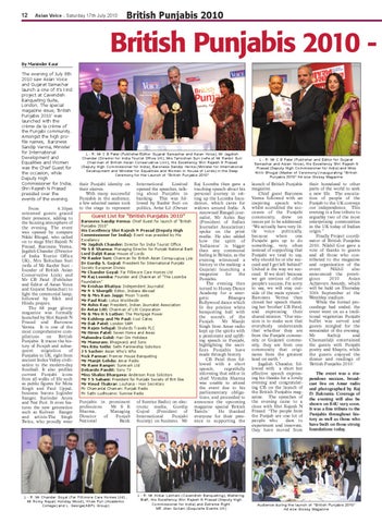 Raj Loomba then gave a touching speech about his personal journey in setting up the Loomba foundation, which cares for widows around India. A renowned Bengali jourGuest List for “British Punjabis 2010” nalist, Mr Ashis Ray Baroness Sandip Verma: Chief Guest for launch of “British (President of Indian Punjabis 2010” Journalist Association) His Excellency Shri Rajesh N Prasad (Deputy High spoke on the print Commissioner for India): Event was presided by His media. He also added Excellency how the spirit of Mr Jagdish Chander: Director for India Tourist Office 'Indianess' is bigger Mr S R Sharma: Managing Director for Punjab National Bank than any communal Lord Daljit Rana: House of Lords feeling in Britain, as the Mr Ranbir Suri: Chairman for British Asian Conservative Link evening witnessed a Dr Gurdip S. Gujral: President for International Punjabi history in the making- a Society European Divisio Gujarati launching a Mr Chander Goyal: Far Fillimore Care Homes Ltd magazine for the Mr Raj Loomba: Founder and Chairman of “The Loomba Punjabis. Foundation” The evening then Mr Krishan Bhatiya: Independent Journalist turned to Honey Dance Mr N S Shergill: Editor, Indians Abroad Academy for a enerMr & Mrs Ram Jaggi: Moon Travels getic Bhangra Mr Paul Riat: Lotus Worldwide Bollywood dance which Mr Ashis Ray: President, Indian Journalist Association lit the pristine white Dr Avtar Litt: Chairman of Litt Corporation banqueting hall with Mr & Mrs H S Luther: The Mortgage Power the sounds of the Mr Kuldeep and Mr Paul: Kool Cakes Punjab. Mr Manjit Mr Dak Patel: London SAM Singh from Amar radio Mr Rajen Sehgal: Skylords Travels PLC kept up the spirits with Mr Hiren Patel: Seven Home and Away a passionate and upliftMahendra Gohil: Hari Om Holidays ing speech in Punjabi, Mr Manuram: Bhagwanji and Sons highlighting the sacriMrs Ritu Sethi: Sethi Partnership Solicitors fices Punjabis have J S Sacher: Asian Who’s Who made through history. Nick Parmar: Premier House Banqueting CB Patel then folMr Manjit Gehdu: Amar Radio lowed with a short Mr Rami Ranger: Sunmark Ltd speech, regretfully Debarshi Pandit: Sony TV informing that editor in Miss Shalini Bhargava: Anderson Ross Solicitors chief Virendra Sharma Mr T S Sahani: President for Punjabi Society of Brit Ilse was unable to attend Mr Vinod Thakrar: Louhana - Hon Secretary the event due to his Mr Chamanlal Chaman: Punjab Radio parliamentary obligaMr Sathi Ludhiyanvi: Sunrise Radio tions, and proceeded to announce the upcoming of Sunrise Radio) on elecPunjabis in prominent magazine special 'British tronic media, Gurdip professions. Mr S R Tamils.' He thanked Gujral (President of Sharma, Managing everyone for their presInternational Director of Punjab Punjabi ence in supporting the National Bank Society) on business. Mr