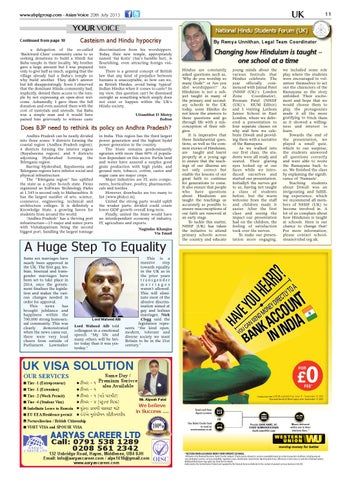 discrimination from his worshippers. Today, their new temple, appropriately named ‘Sai Kotis’ (Sai’s humble hut), is flourishing, even attracting foreign visitors. There is a general concept of British law that any kind of prejudice between humans is unacceptable, so how can we, as British Hindus, avoid being ‘typical’ Indian Hindus when it comes to caste? In my view, this question can’t be dismissed outright as something which simply does not exist or happen within the UK’s Hindu society. Uttambhai D Mistry Bolton