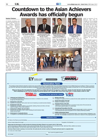At the launch, the beer was sponsored by Cobra Beer, wine and soft drinks by Sun Mark Ltd, and the canapés by Ragasaan. Regarding the South Asian achievers and the awards, Publisher/Editor of Gujarat Samachar/Asian Voice, CB Patel said, “In the landmark 15th year of the Asian Achievers Awards, it brings me much pride to pay special homage to British Asian men and women who help to both run our country and also protect it. Their remarkable deeds can be lifechanging, and even lifesaving, but these people go largely unrecognised." The sponsored charity of this event is The Loomba Foundationfocussing on caring for women around the world.