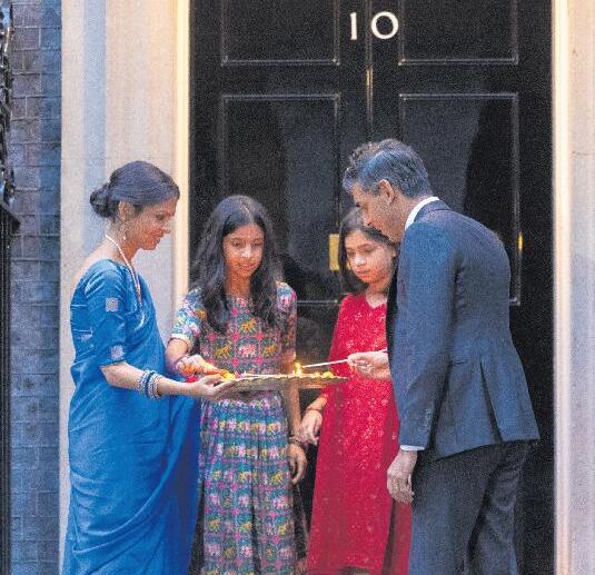 Prime Minister Rishi Sunak, wife Akshata Murty and daughters Krishna and Anoushka, lighting diyas for Diwali outside 10 Downing Street
