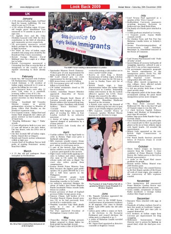 • A UK citizen of Indian origin, Asif Patel fined for human trafficking. He was asked to pay up £ 0.30 mn. • A UK citizen of Indian origin, 61-yearold temple priest Shashikant Vyas sentenced to 54 months in prison in a rape case. • Dr. Jagdish Dave and Mr. Uday Dholakia honored with OBE for their contribution in the field of education and community services respectively. • UK government announces second bailout package for the banking sector to fight recession. • Dev Patel, an actor of Indian origin awarded with young actor award by the Broadcast Film Critics Association. • British Foreign Minister David Miliband stays for a night at a village hut in India. • British Government announced a Citizenship Test Plan to stop the flow of immigrants in the country and to regulate citizenship to those already here.