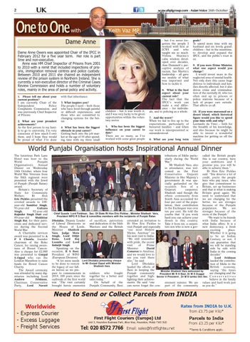 called the British people this is our country, have your ambitions and I promise you, you will be able to achieve them.” Rt Hon Eric Pickles said: “You deserve a lot of credit, you're the people here who pay taxes, who give that commitment to Britain, set up businesses and that is what is making Britain great again. We need to understand that we are changing for the better, we are stronger because of the Punjabi population. We are stronger because of the Chief Guests Lord Feldman, Sec. Of State Rt Hon Eric Pickles , Minister Shailesh Vara, roots of the Punjab.” President WPO R S Baxi & committee members with the recipients of Punjab Ratan “We want to be friends Dholakia, Deputy Leader of sacrifices, patriotism extended an invitation to with India because of of Liberal Democrats in and dedication of the Sikh Rt Hon Eric Pickles to what India offers. It is a the House of Lords, Warriors and the British visit Punjab and especially new democracy, a fresh Minister Shailesh “our most Holiest exciting place. Vara, Judge Mota Shrine, Amritsar” on Whether it is going Singh, Lord Diljit his next visit to India. to be an Indian Rana, Lord Raj “We still remember Century or not, I Loomba and Lord with pride, the recent can guarantee that Indarjit Singh. visit of Prime we will be standing Speaking on the Minister David side by side with occasion, R S Baxi, Cameron to Amritsar, India in the coming President of WPO and we would love to decades” (European Division) see you visit there Lord Feldman “A lot more needs Lord Dholakia presenting cheque also,” he said. lauded the contributo be done to restore to Mr Gurpal Oppal with Minister Lord Dholakia tion of Sikhs to the Shailesh Vara the legacy of our falllauded the efforts of British economy, en heroes as we preBaxi in keeping the saying “the times Minister Shailesh Vara welcomed by Punjab community pare to commemorate in soldiers who fought are changing and the President Mr R S Baxi, Dr M S Duggal together and high- Senior V President , Dr M S lamba Gen Sec C o n s e r v a t i v e s 2014, 100 years since the together for a better and lighting their achieveoutbreak of the first world safer today.” believe in the family ments. He said “one war. ”The visit certainly On behalf of the values and hard work just ernment minster. We are can never forget the conbrought heroic memories Punjabi Community, Baxi as you do.” part of the community