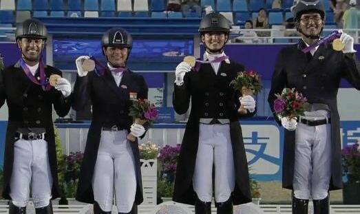 In dia won it s fir st g old m e d a l o n t h e d a y in E qu e st r i a n , w i t h t he dr essage tea m securing a h i st o r i c t o p - p od i u m finish, bea ting the lik es of Chin a an d Hon g Kong in Asian game s The quar tet of Sudipti Haje la, Div yak riti Sin gh, Hrida y Vipul Chheda , a nd An ush Ag arwa lla scor ed a t ota l of 209 205 to win gold