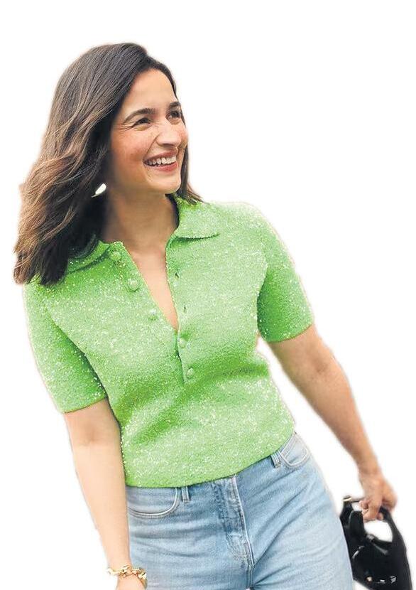 Alia wore an embellished green top paired with flared denims, a Gucci bracelet, a bag and black shades She wore a Gucci Jackie 1961 Small Leather shoulder bag and the runway collection Ancora red pointed stilettos