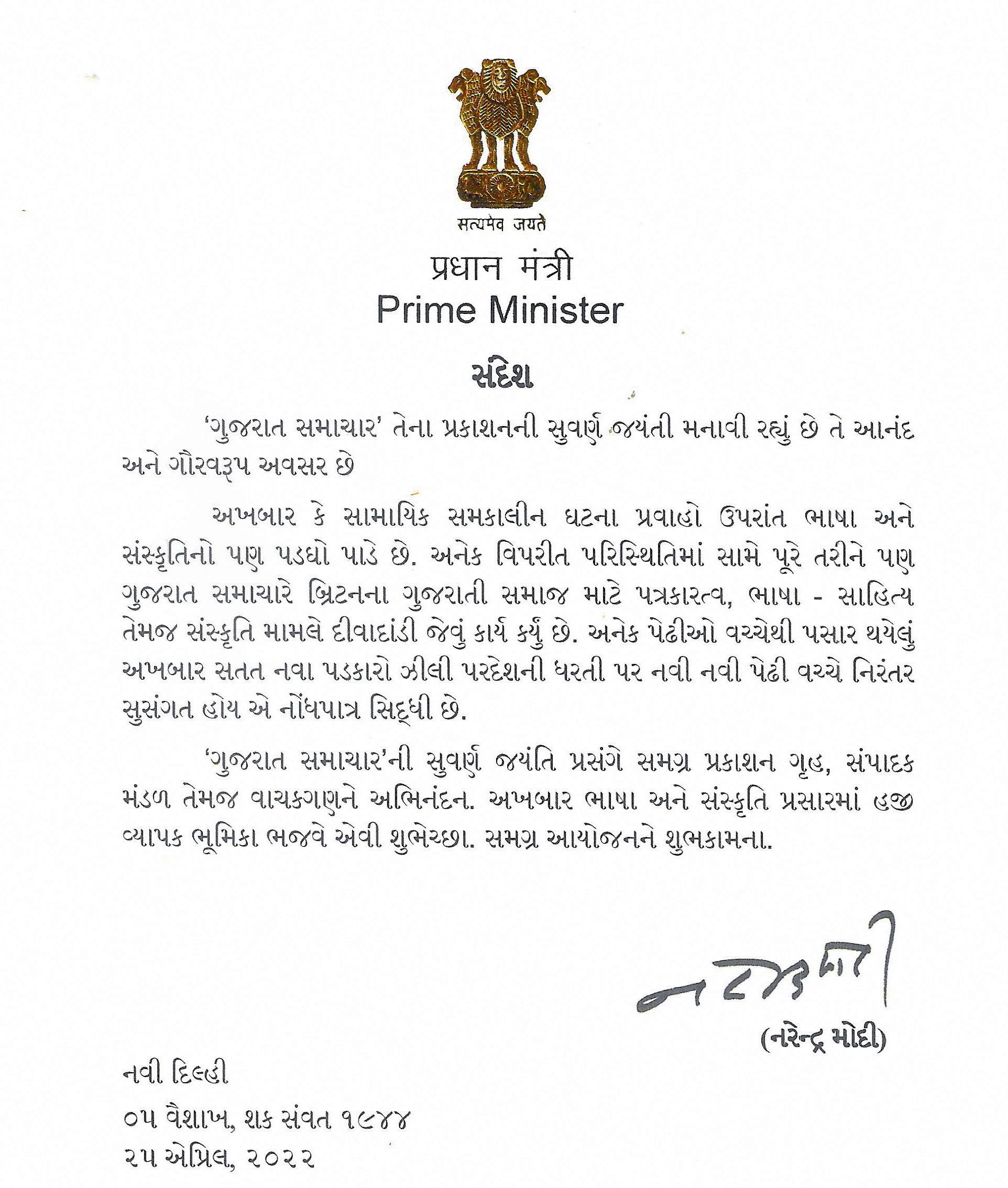 It is an honour to have received a letter of appreciation from the Honourable Prime Minister of India, Shri Narendra Modi who has extended his felicitation on the occasion of the golden jubilee of Gujarat Samachar to the entire publishing house, editorial team and community. The PM has also congratulated us on our endurance, despite several adverse circumstances and appreciated that Gujarat Samachar has acted as a lighthouse in the area of journalism, language - literature and culture for Britain’s Gujarati diaspora. (Orginal Letter in Gujarati)