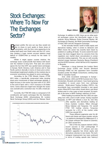 Stock Exchanges: Where To Now For The Exchanges Sector? umper profits. No one can say they would not like to share in such spoils in these times of uncertainty, with the Euro zone appearing to be pulling itself apart over Greek woes and the U.S. economy posting a huge current account balance (read deficit) of -US$473.4bn (a minus!) for the latest 12 months. Whilst it might appear counter intuitive, the exchange sector could provide that relative safe haven over the medium to long term. That said, one cannot ignore the fact that 2011 saw quoted stock exchanges in Europe, North America, Latin America and in Asia Pacific perform dismally in terms of share price action. Interestingly heightened volatility on the markets due to economic uncertainty has played to some exchanges. According to the FTSE Mondo Visione (‘FTSE MV’) index, a specifically constructed index tracking share price movements of listed exchanges globally, a slight recovery in the sector has been seen in Q1 2012 to the end of April, with a +8.5% increase in US dollar terms. Some observers might have thought the sector was oversold and a correction due. It’s still a mixed picture. Currently, the FTSE MV index is composed of 23 constituents and spans exchanges like the Australian Stock Exchange (ASX), Johannesburg SE, London Stock Exchange Group (LSEG) and the Warsaw Stock