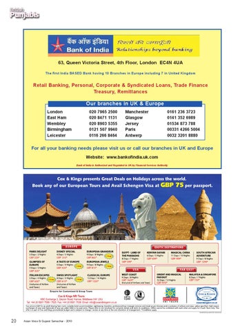 For all your banking needs please visit us or call our branches in UK and Europe Website: www.bankofindia.uk.com Bank of India is Authorized and Regulated in UK by Financial Services Authority
