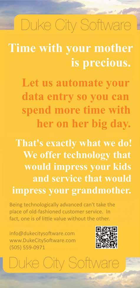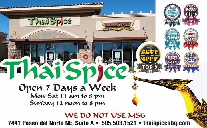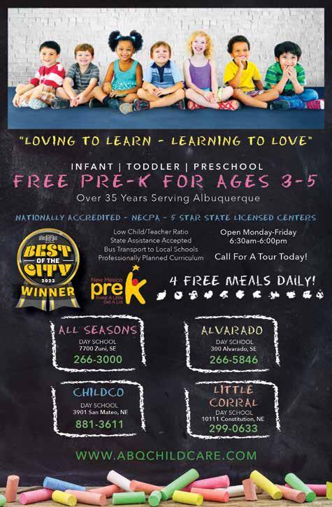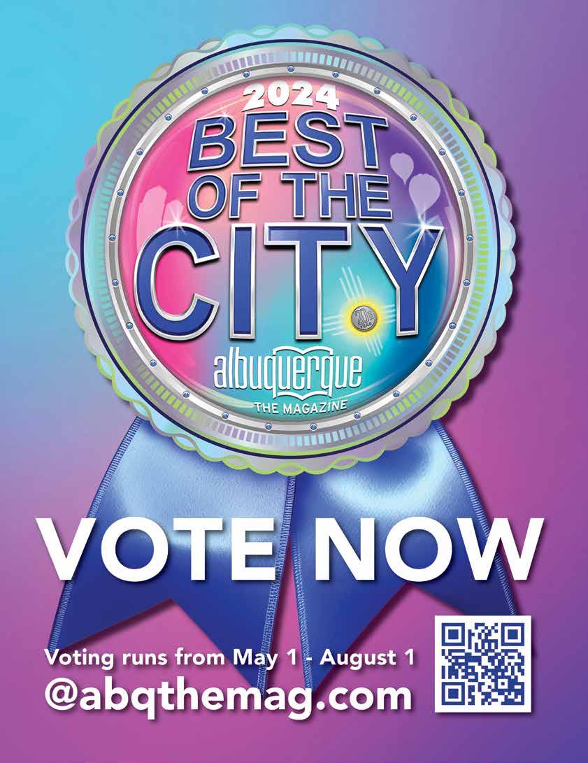 SUBSCRIBE! Annual subscriptions to Albuquerque The Magazine are $19 for 11 issues. You may subscribe directly from our website. Send check or money order to: Albuquerque The Magazine 1550 Mercantile Ave. NE, Top Floor Albuquerque, NM 87107 phone: 505-842-1110 • fax: 505-842-1119 www.abqthemag.com ©2024 Albuquerque The Magazine All Rights Reserved