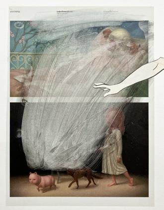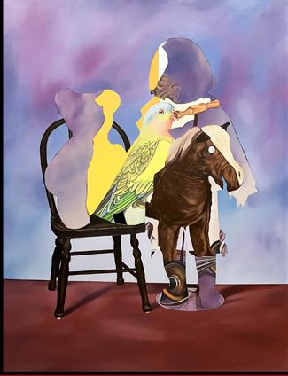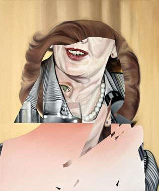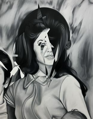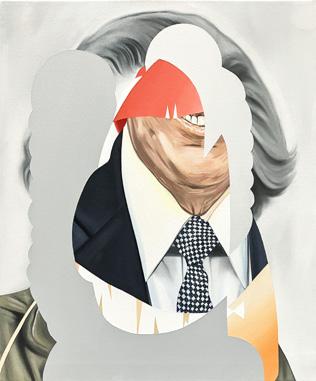 imágenes las manipula digitalmente. Y en algunas pocas piezas, la reconfiguración se centra en el desplazamiento de la imagen “original” hasta su traducción en la pintura. Así sucede con Un caso de histérica ceguera histórica (o la masculinización de la política) (2025), que parte de la captura de un registro de una transmisión televisiva, lo que Hito Steyerl denominaría una “imagen pobre”; una copia en movimiento, trasladada y reciclada, pero de amplia circulación. 4