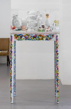 Mueble de Guanacaste pintado por un artesano de Sarchí, arena decorativa y juguetes encontrados intervenidos