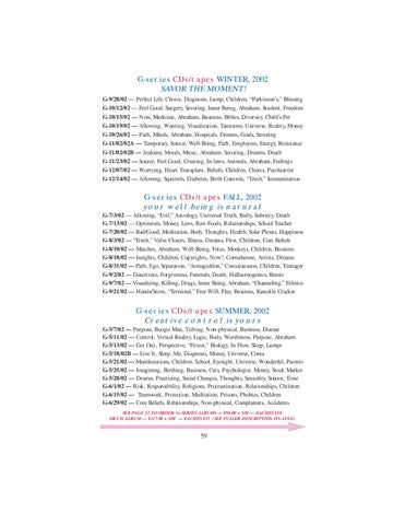 G-series CDs/tapes WINTER, 2002 SAVOR THE MOMENT! G-9/28/02 — Perfect Life, Choice, Diagnosis, Lump, Children, “Parkinson's,” Blessing G-10/12/02 — Feel Good, Surgery, Savoring, Inner Being, Abraham, Student, Freedom G-10/15/02 — Now, Medicine, Abraham, Business, Bibles, Diversity, Child’s Pet G-10/19/02 — Allowing, Wanting, Visualization, Tantrums, Universe, Reality, Money G-10/26/02 — Path, Minds, Abraham, Hospitals, Dreams, Goals, Savoring G-11/02/02A — Temporary, Source, Well-Being, Path, Employees, Energy, Resistance G-11/02/02B — Jealousy, Moods, Music, Abraham, Savoring, Dreams, Death G-11/23/02 — Source, Feel Good, Creating, In-laws, Animals, Abraham, Feelings G-12/07/02 — Worrying, Heart Transplant, Beliefs, Children, Chores, Psychiatrist G-12/14/02 — Allowing, Squirrels, Diabetes, Birth Controls, “Truth,” Immunization