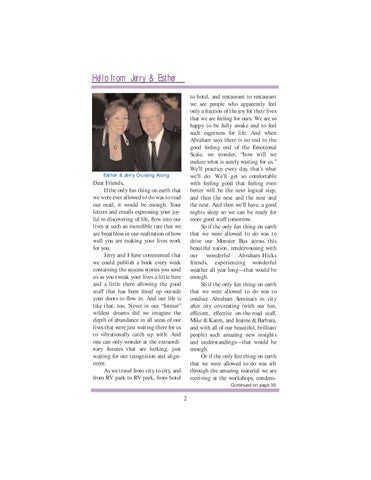 Dear Friends, If the only fun thing on earth that we were ever allowed to do was to read our mail, it would be enough. Your letters and emails expressing your joyful re-discovering of life, flow into our lives at such an incredible rate that we are breathless in our realization of how well you are making your lives work for you. Jerry and I have commented that we could publish a book every week containing the success stories you send us as you tweak your lives a little here and a little there allowing the good stuff that has been lined up outside your doors to flow in. And our life is like that, too. Never in our “former” wildest dreams did we imagine the depth of abundance in all areas of our lives that were just waiting there for us to vibrationally catch up with. And one can only wonder at the extraordinary futures that are lurking, just waiting for our recognition and alignment. As we travel from city to city, and from RV park to RV park, from hotel