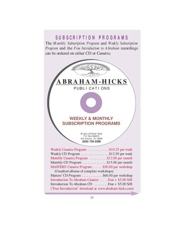 Weekly Cassette Program . . . . . . . . . . . .$10.25 per week Weekly CD Program . . . . . . . . . . . . . . . .$12.50 per week Monthly Cassette Program . . . . . . . . . .$12.00 per month Monthly CD Program . . . . . . . . . . . . . .$15.00 per month MASTERS’ Cassette Program . . . . . .$50.00 per workshop (Unedited albums of complete workshops) Masters’ CD Program . . . . . . . . . . . .$60.00 per workshop Introduction To Abraham Cassette . . . . .Free + $5.00 S/H Introduction To Abraham CD . . . . . . . .Free + $5.00 S/H (“Free Introduction” download at www.abraham-hicks.com) 29
