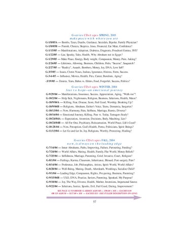 G-series CDs/tapes SPRING, 2005 make peace with where you are G-1/8/05A — Bombs, Taxes, Deaths, Guidance, Suicidals, Bipolar, Family Physician? G-1/8/05B — Punish, Choices, Skeptics, Jesus, Financial, Eat Meat, Confidence? G-1/15/05 — Manifestations, Adoption, Diabetes, Diagnosis, Preschool Genius, SVS? G-1/22/05 — Liar, Spooky, Tales, Health, Why Abraham not in Egypt? G-1/29/05 — Make Peace, Energy, Body weight, Compassion, Money, Pain, Asking? G-2/26/05 — Lifetimes, Allowing, Business, Children, Pedo, “Success”, Sasquatch? G-2/27/05 — “Reality”, Assault, Bombers, Money, Joy, DNA, Love Self? G-3/5/05 — Issues, Clown Noses, Jealous, Ignorance, Heiress, Form, Success. G-3-6-05 — Influence, Movies, Health, Pets, Career, Boredom, Aging? -3/19/05 — Desires, Tears, Babes vs. Elders, Food, Forgetful, Success, Politics? G-series CDs/tapes WINTER, 2004 fear to hope—an emotional journey G-9/29/04 — Manifestations, Insurance, Success, Appreciation, Aging, “Walk-ins”? G-10/2/04 — Help Sick, Nightmares, Religion, Business, Solutions, Health, Mates? G-10/9/04A — Killing, Fear, Disease, Score, Feel Good, Worship, Breaking Up? G-10/9/04B — Religions, Abraham, Esther’s Voice, Teens, Dementia, Surgeries? G-10/13/04 — Now, Harmony, Pain, Stiffness, Marriage, Rumis, Divorce? G-10/16/04 — Emotional Journey, Killing, Past vs. Today, Teenagers Study? G-10/24/04A — Expectation, Attention, Decisions, Body, Matching, Lies? G-10/24/04B — All For One, Psychiatry, Reincarnation, World Peace, Life’s Good? G-10-28-04 — Now, Perception, God’s Health, Porno, Politicians, Spirit Beings? G-11/13/04 — Let Go and Let In, Joy, Religions, Worthy, Protecting, Healing? G-series CDs/tapes FALL, 2004 now, is always on the leading edge G-7/14/04 — Inner Abrahams, Paths, Improving, Failure, Partnering, Fending? G-7/24/04 — World Affairs, Mating, Health, Family, Flat World, Money Beliefs? G-7/25/04 — Selfishness, Marriage, Parenting, Grief, Invasive, Court, Religion? G-8/1/04 — Feelings, Karma, Classroom, Inheritance, Blessed, Post-surgery, Pain? G-8/14/04 — Preference, Job, Philosophies, Artists, Spirit World, World Affairs? G-8/28/04 — Well-Being, Mating, Death, Afterdeath, Weddings, Socialize Child? G-9/1/04 — Leading Edge, Compassion, Rights, Pre-paving, Business, Parenting? G-9/15/04B — ULO, DNA, Practice, Saviors, Parenting, Spooked, My Purpose? G-9/18/04 — Joy, The Way, Divorce, Health, Mother, Intentions, Impersonal Source. G-9/22/04 — Solutions, Justice, Spooks, Evil, Feel Good, Dating, Improvement? SEE PAGE 32 TO ORDER: G-SERIES ALBUMS — $90.00 + S/H — EACHES $10 OR CD ALBUM — $117.00 + S/H — EACHES $15 (SEE FULLER DESCRIPTION ON-LINE)