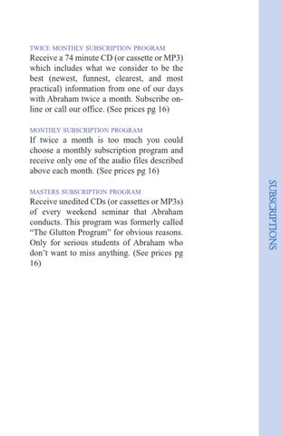 If twice a month is too much you could choose a monthly subscription program and receive only one of the audio files described above each month. (See prices pg 16) Receive unedited CDs (or cassettes or MP3s) of every weekend seminar that Abraham conducts. This program was formerly called “The Glutton Program” for obvious reasons. Only for serious students of Abraham who don’t want to miss anything. (See prices pg 16)