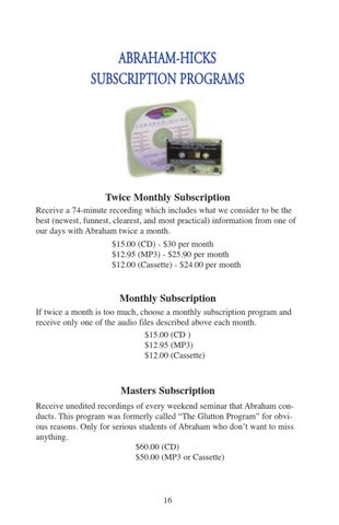 Receive a 74-minute recording which includes what we consider to be the best (newest, funnest, clearest, and most practical) information from one of our days with Abraham twice a month. $15.00 (CD) - $30 per month $12.95 (MP3) - $25.90 per month $12.00 (Cassette) - $24.00 per month