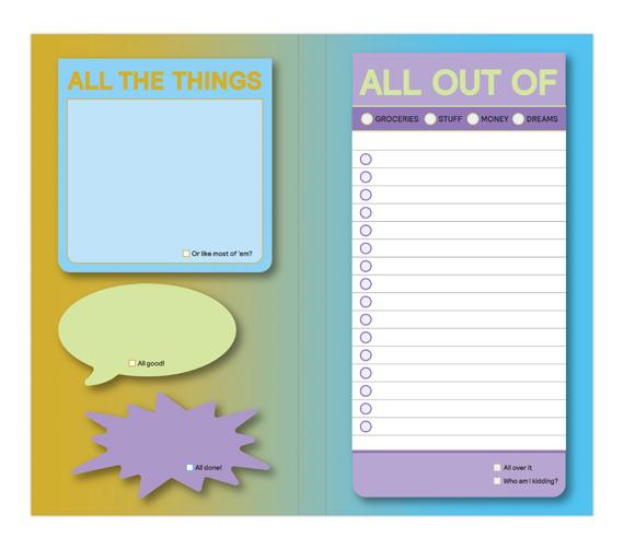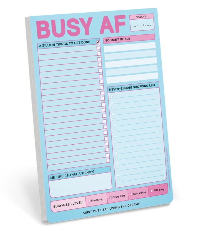 Click here for more Classic Pads NEW! No. 9781683493839 Busy AF £7.95 NEW! No. 9781683493846 Shit List £7.95 Classic Pads—Fresh Look! SPECS: 60 sheets; adhesive binding, All Out Of Vegan and Things ... House have magnet on back SIZE: 6 x 9 inches; 15.2 x 22.9 cm | PKG: Shrinkwrapped | INNER: 6 | PRICE: £7.95 TO ORDER: email info@abramsandchronicle.co.uk • or click here for representation pagePG 6 NEW! AVAILABLE NOW