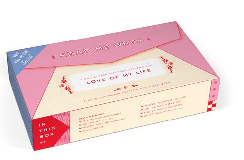 SPECS: 9 paper sheets; 9 envelopes; foil-stamped box with magnetic lid; cotton ribbon; cardstock sleeve | SIZE: 7.25 x 4 x 1.5 inches; 18.4 x 10.1 x 3.8 cm | INNER: 3 | PRICE: £13.95 FILL IN THE LOVE ® READ ME WHEN BOXES No. 9781683490302 Letters to My Incredible Dad £13.95 No. 9781683490319 Letters to You Before Our Wedding £13.95 No. 9781601068682 Letters to the Love of My Life £13.95 No. 9781601068699 Letters to My Wonderful Mom £13.95 TO ORDER: email info@abramsandchronicle.co.uk • or click here for representation pagePG 14