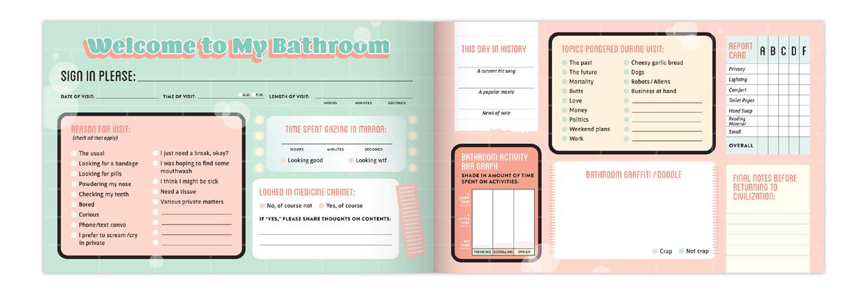 SPECS: hardcover with foil stamping, 112 pages; full-color throughout; ribbon page marker | SIZE: 7.25 x 4.75 inches; 18.4 x 10.2 cm | INNER: 3 | PRICE: £13.95 Bathroom Guest Book—Fresh Look! NEW! No. 9781683493907 Bathroom Guest Book (Refresh) £13.95 TO ORDER: email info@abramsandchronicle.co.uk • or click here for representation pagePG 8 NEW! AVAILABLE NOW