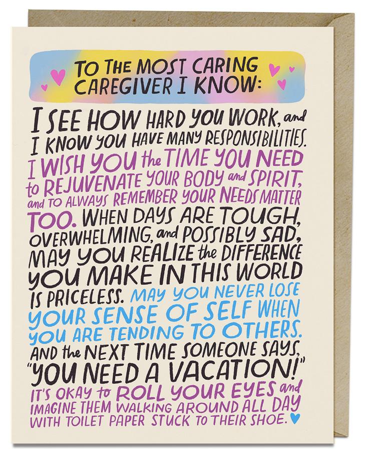 I want you to close your eyes and give yourself a hug (even if you feel silly). Try to feel my love for you, because I AM HUGGING YOU RIGHT NOW, no matter how far apart we may be. You’ve mothered and me in so many ways, in hard times, and I’ll always remember how you helped me Now want you to mother yourself a bit. Please take time to Give yourself permission to Treat yourself like Indulge in some You deserve everything that makes you feel deeply comforted, hopeful, and Big hugs,