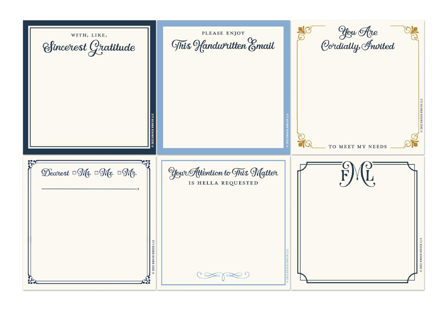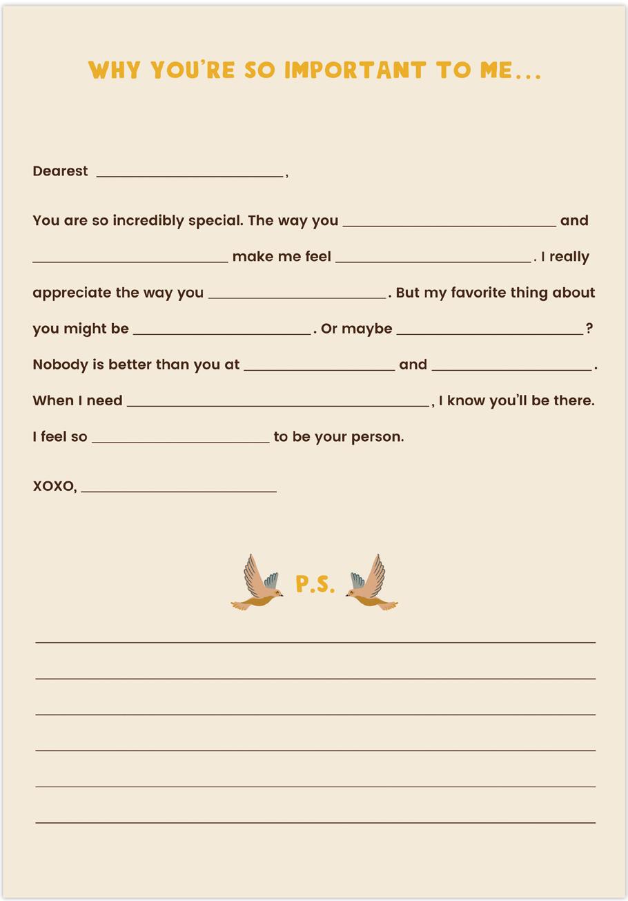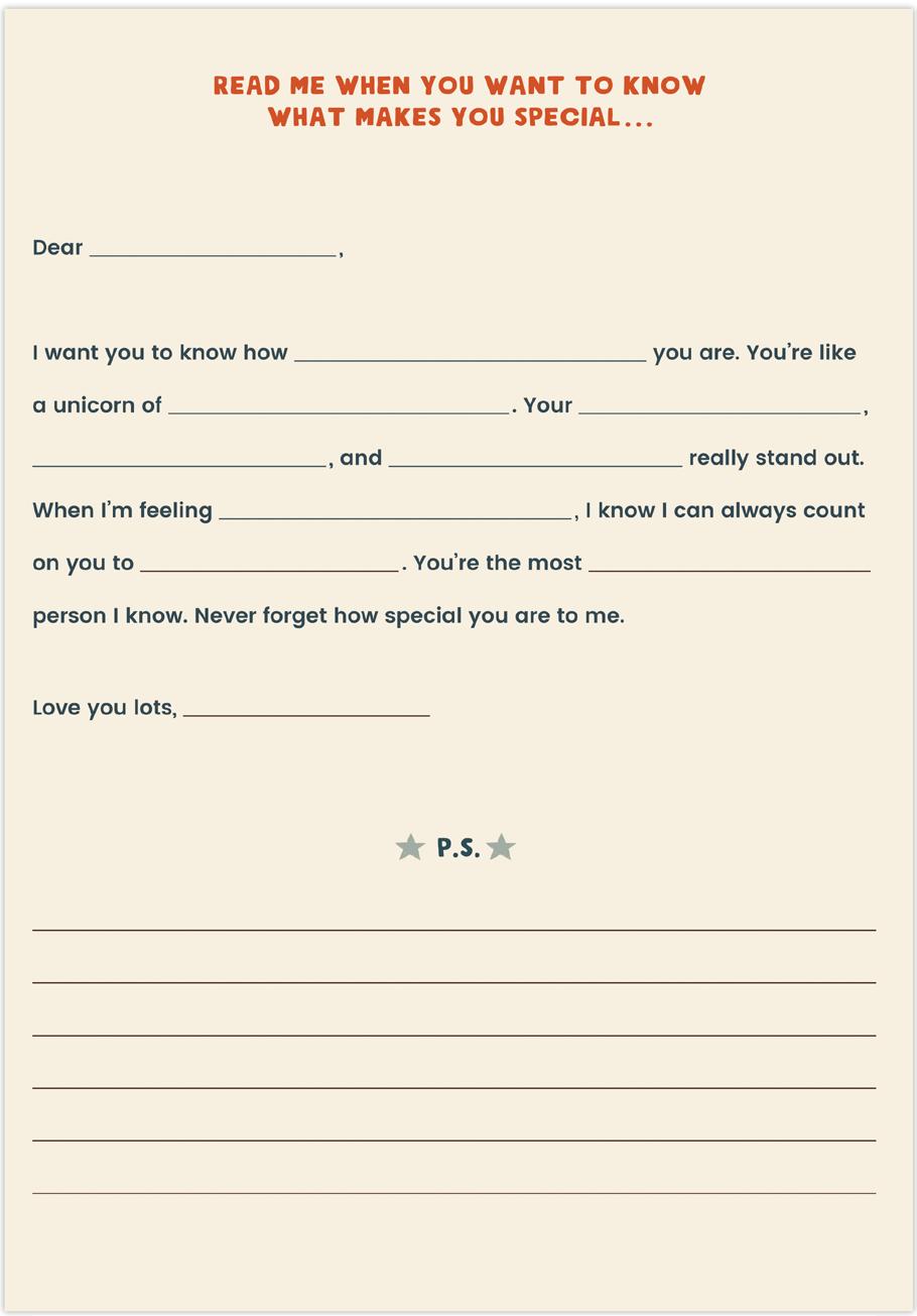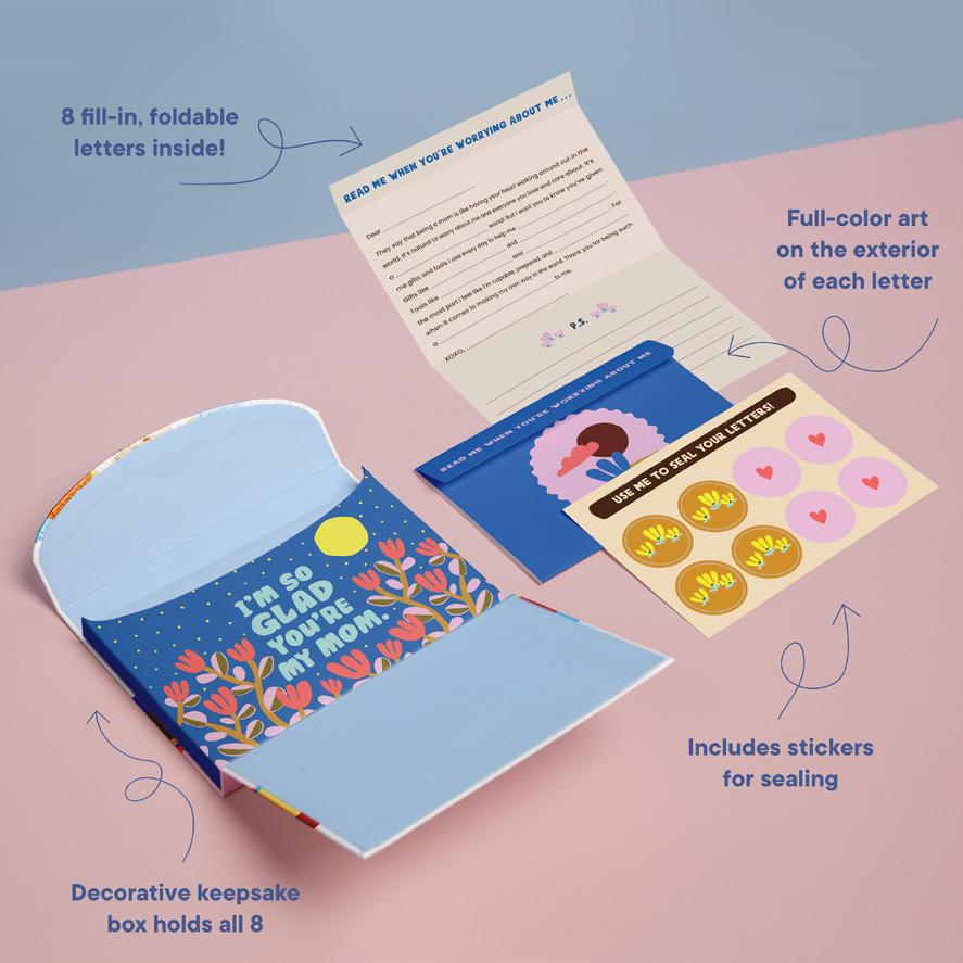 8 different letters to fill out, seal, tuck into keepsake letter box, and give to a loved one.