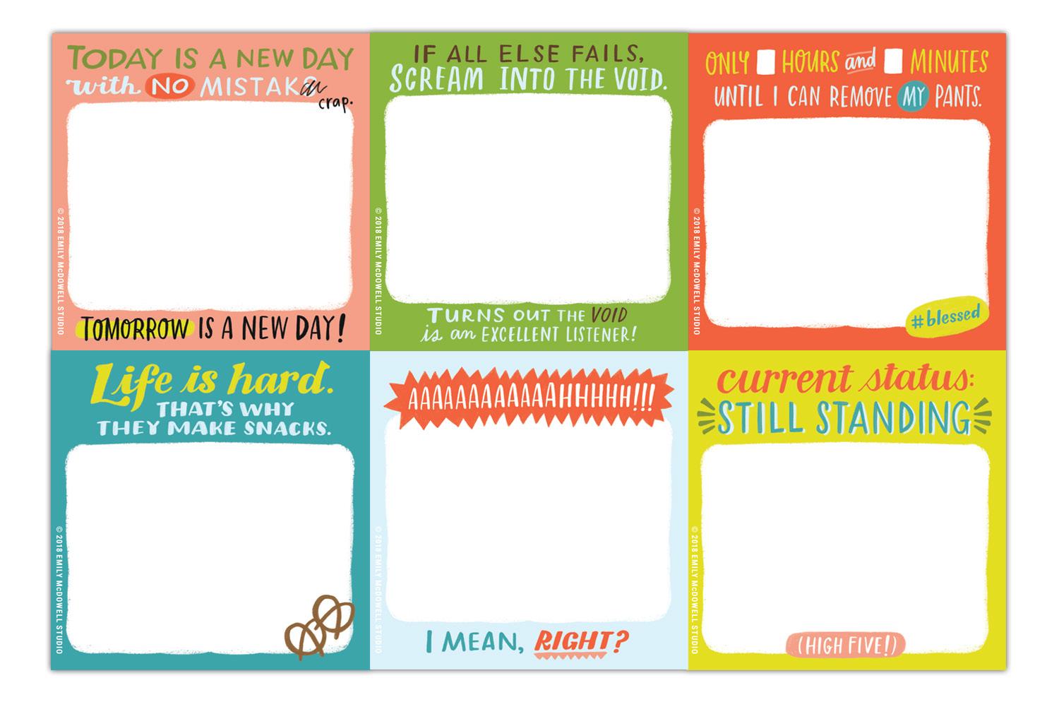 SIZE: PACKET: 8.25 X 5.5 INCHES; 21 X 14 CM; PADS: 2.75 X 2.75 INCHES; 7 X 7 CM | SPECS: 6 PADS; 40 SHEETS EACH WITH REPOSITIONABLE ADHESIVE |
