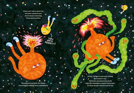 Maintaining healthy relationships is hard work. After 4.5 billions years together Moon has had enough of Earth. So she packs her things and sets off to see what the Solar System has to offer. On her heavenly tour from scorching Venus to giant Jupiter, Moon meets Mars and many other moons, plays with Saturn's rings, and avoids stinky Uranus and chilly Neptune. Somewhere at the edge of the cosmos, Moon realizes how much she misses spinning around her longtime friend, Earth, and discovers that there's no place like home. Sometimes what we're looking for is closer than we think.