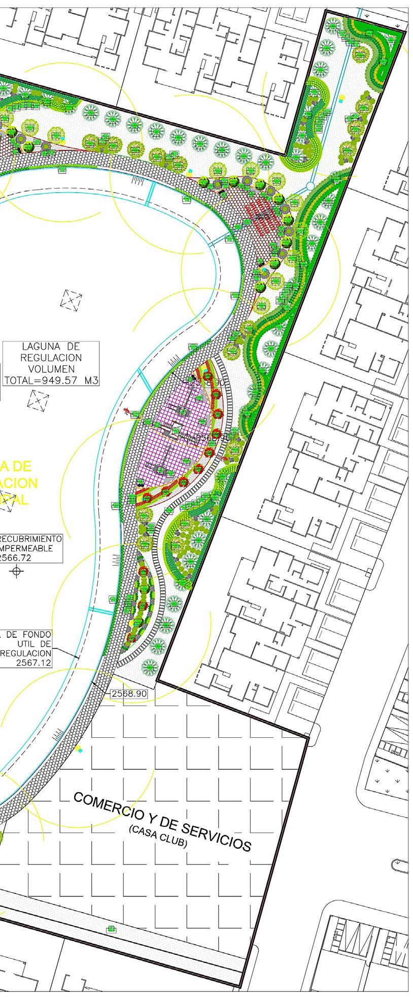 As part of the infrastructure of each Consorcio Ara housing complex, a rain regulation vessel is incorporated as part of the hydro-sanitary infrastructure. For this complex, the regulating vessel was integrated, creating a lagoon that would function as an amenity for the complex.