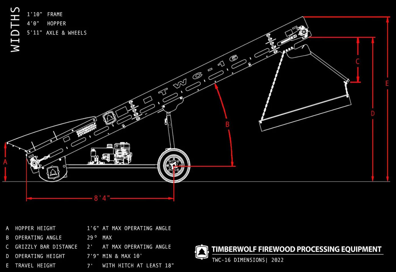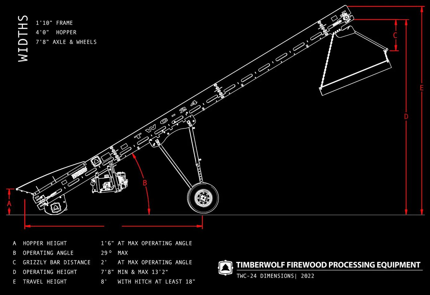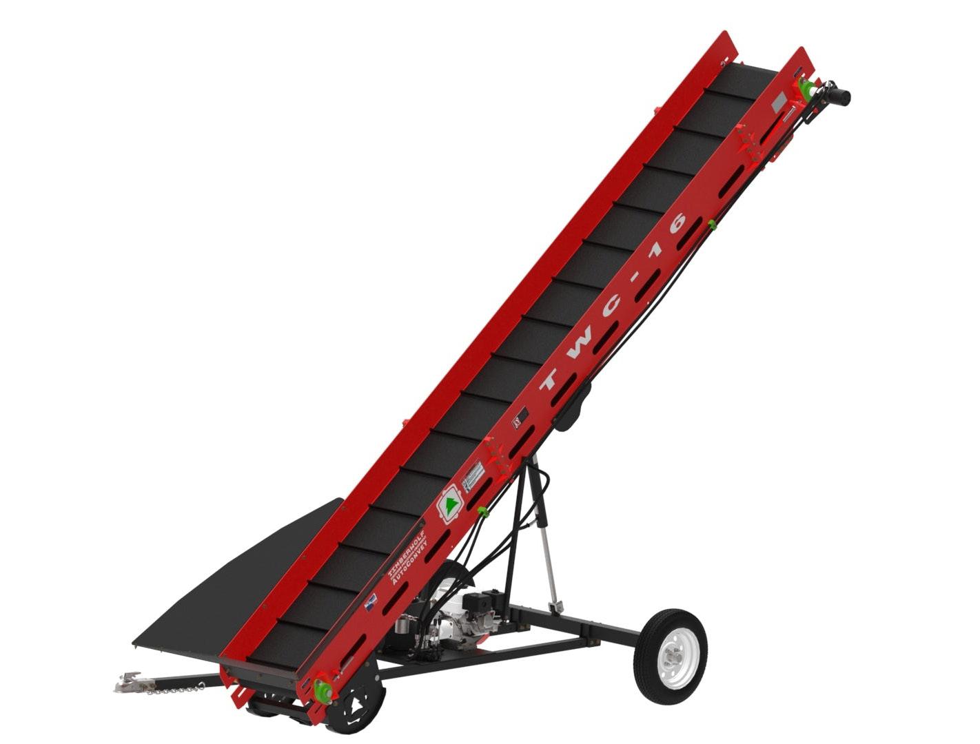 • 12’ long transportable firewood conveyor with a max operating height of 8’, minimum height of 5’5”, and a travel height of 5’3”
