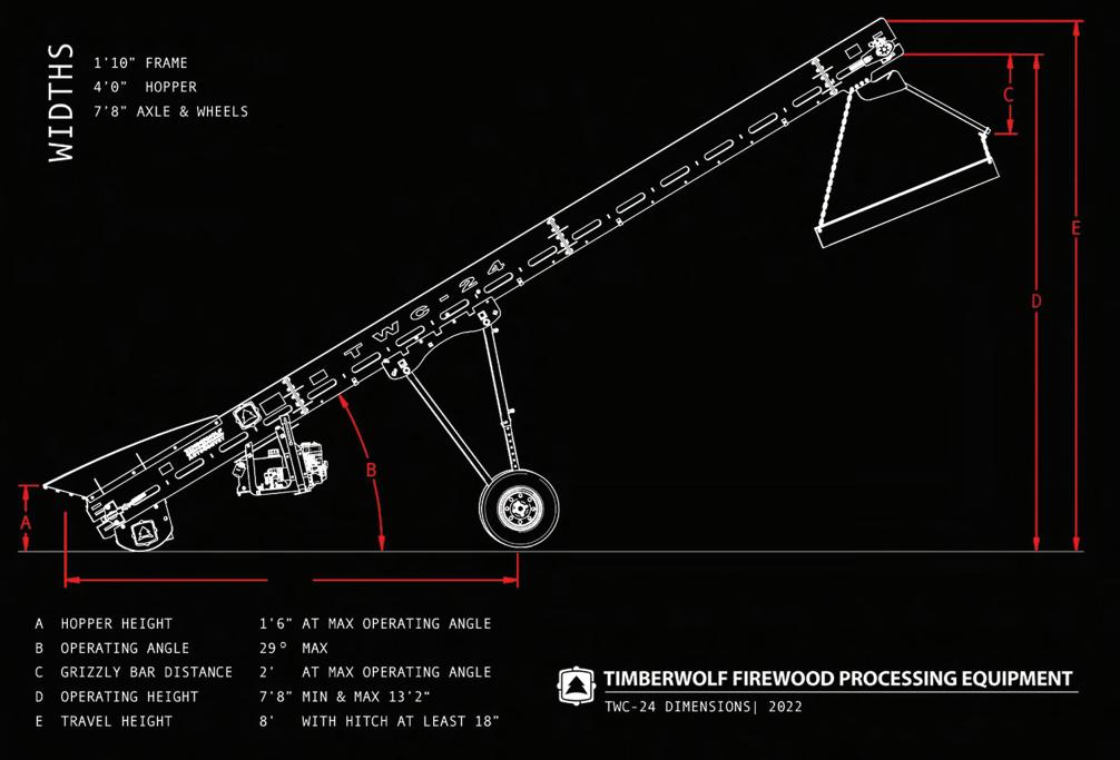 • The TW-10 is an extra-large log splitter capable of splitting logs as long as 12’ and up to 5’ in diameter, into quarters, so they can be fed into a firewood processor or wood chipper.