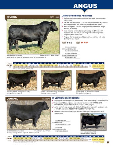 Arguably the best young bull to sell anywhere in the entire spring 2016 sale season Impeccable ABS calving ease and maternal tabulation with COMPLEMENT, HOOVER DAM, and STYLES UPGRADE up close in his pedigree As his mother’s first narural calf, COMMAND helped her to a rock’n good start with a 69lb BW and ratios of 113 WW & YW, 154 IMF and 107 REA Awesome phenotype, tremendous body and thickness - he’s deep, thick, and square made