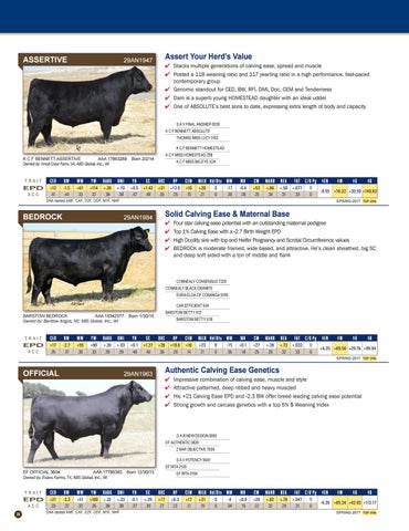Four star calving ease potential with an outstanding maternal pedigree Top 1% Calving Ease with a -2.7 Birth Weight EPD High Docility sire with top end Heifer Pregnancy and Scrotal Circumference values BEDROCK is moderate framed, wide based, and attractive. He’s clean sheathed, big SC and deep soft sided with a ton of middle and flank